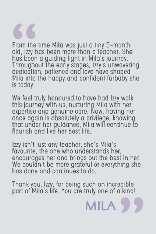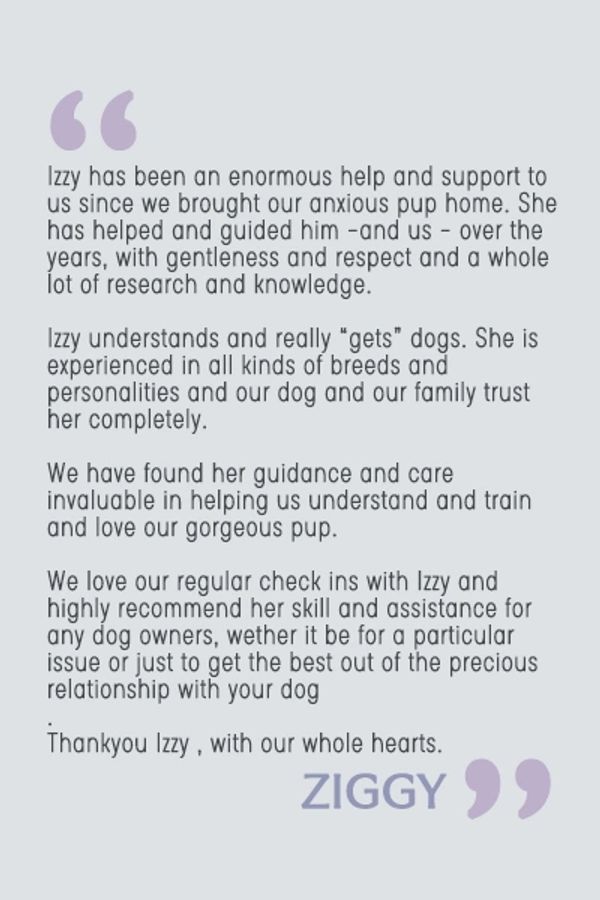 This package includes a tailored behaviour modification program based on your individual dog. Please note that your dog may require further classes based on the issue at hand and your dogs history. Results may vary and some modification programs may take months or years.